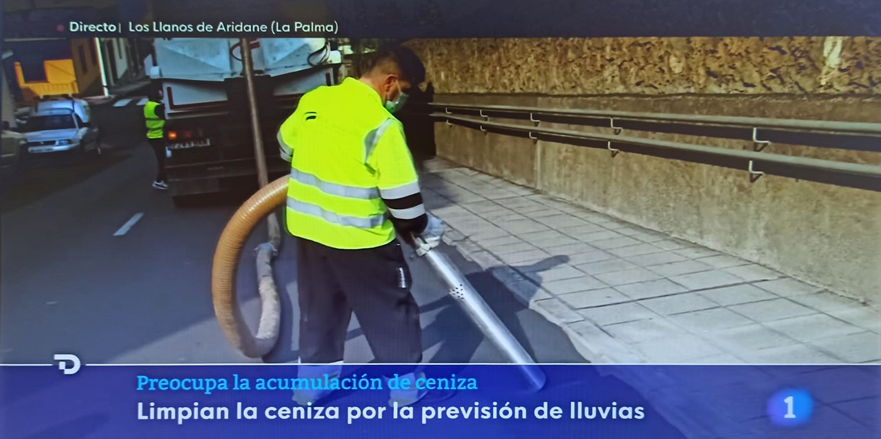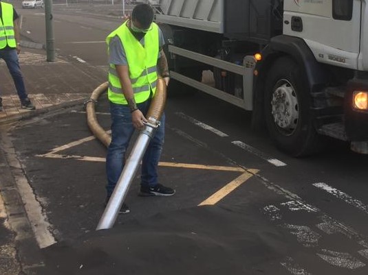 Las autoridades insulares han puesto en marcha un gran camión aspirador que ayudará a limpiar la ceniza que no deja de caer del volcán de Cumbre Vieja, actualmente es el gran problema de muchos palmeros.